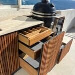 Les matériaux utilisés doivent être spécifiquement adaptés à la vie en extérieur. Par exemple, le plan de travail doit résister aux UV, à la chaleur, au gel et aux chocs. Les surfaces doivent également rester faciles à entretenir et conserver leur aspect au fil des saisons.